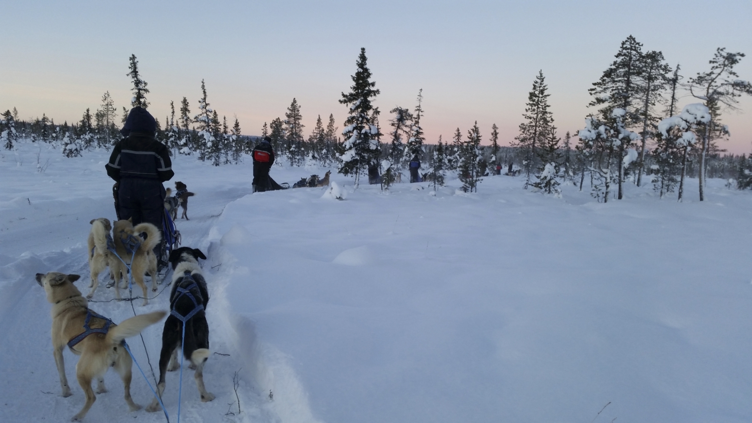 Die heutige Etappe führt Sie auf einer anderen Route als am Vortag wieder zurück ins Wildniscamp am Seeufer des Väkkäräjärvi. Sie überqueren endlos weite, verschneite Sumpflandschaften und zugefrorene Seen und Flüsse und steuern Ihr Gespann durch dichte Waldgebiete und eine traumhafte Winterlandschaft. Die Gegend hier ist sehr tierreich und mit etwas Glück können Sie heute vielleicht ein Rentier, einen Elch oder Fuchs beobachten. Nach dem Versorgen der Hunde und nach dem Abendessen können Sie auch heute wieder in der Sauna des Wildniscamps entspannen.