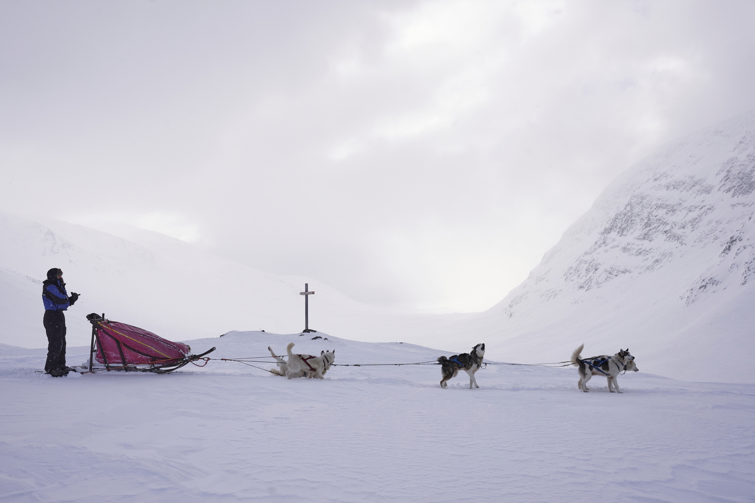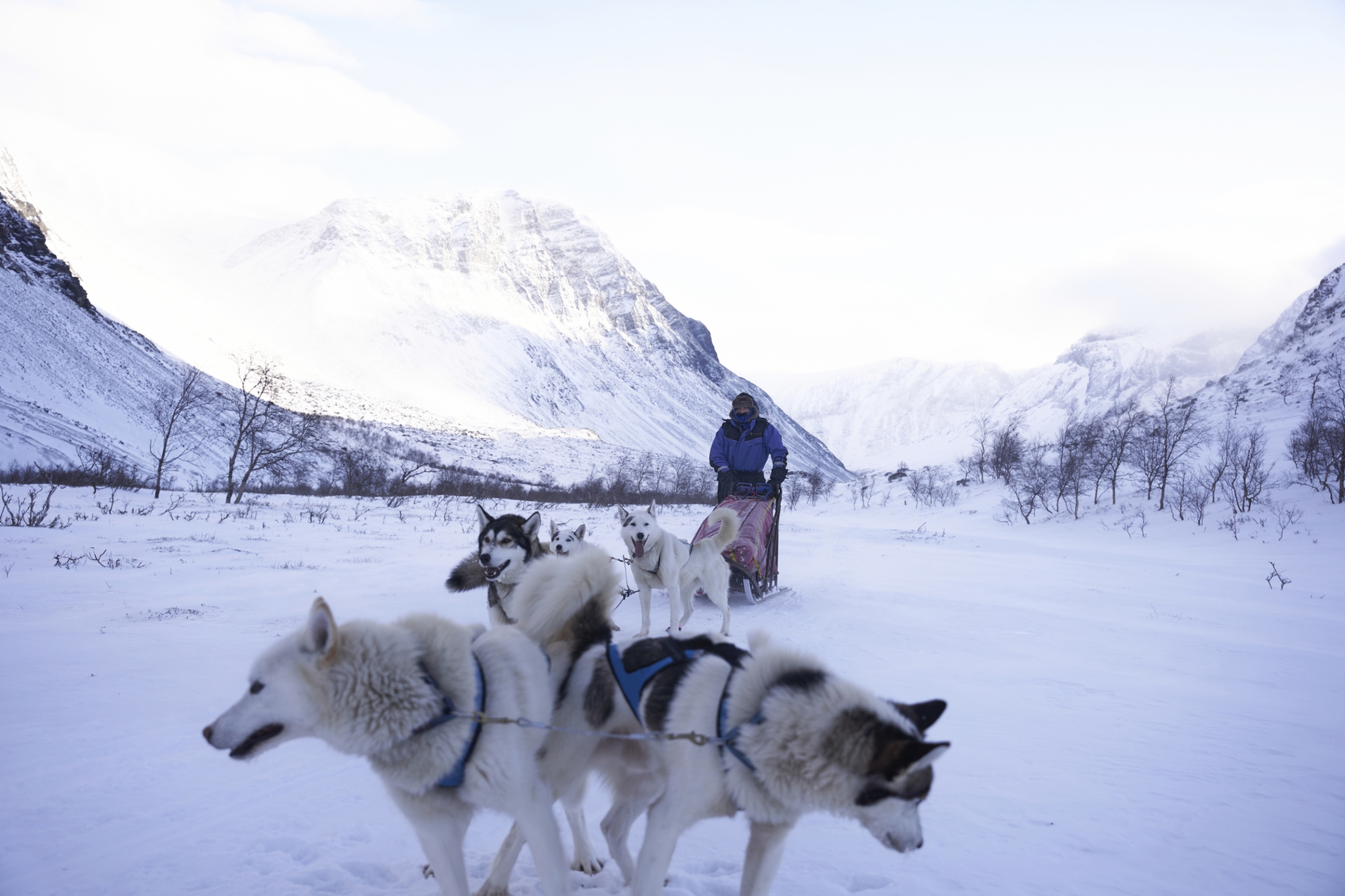 Nach einem gemeinsamen Frühstück werden Hunde, Schlitten und Gepäck im Auto/Minibus verstaut. Ca. 1-stündiger Transfer mit dem Auto/Minibus von der Husky Farm zum Ausgangspunkt Ihrer Safari in den Reisa Nationalpark. Hier werden die Schlitten beladen und die Hunde angespannt. Dann starten Sie zu Ihrer 6-tägigen Safari. Die heutige erste Etappe führt Sie hinein in die traumhafte Berglandschaft des Reisa Nationalparks. Der Reisa Nationalpark ist etwa 806 km² groß und schützt die unberührte und abwechslungsreiche Berglandschaft am Oberlauf des Flusses Reisaelva. Hier finden Sie eine eindrucksvolle Gebirgslandschaft mit zahlreichen Wasserfällen, Schluchten und Canyons. Zum Osten hin zur Grenze nach Finnland flacht die Landschaft etwas ab und wird von weitläufigeren Heide-, Moor- und Sumpflandschaften dominiert. Im Westen grenzt der Nationalpark an das Naturreservat des Raisduottarhaidi mit dem gleichnamigen beeindruckenden Bergmassiv.