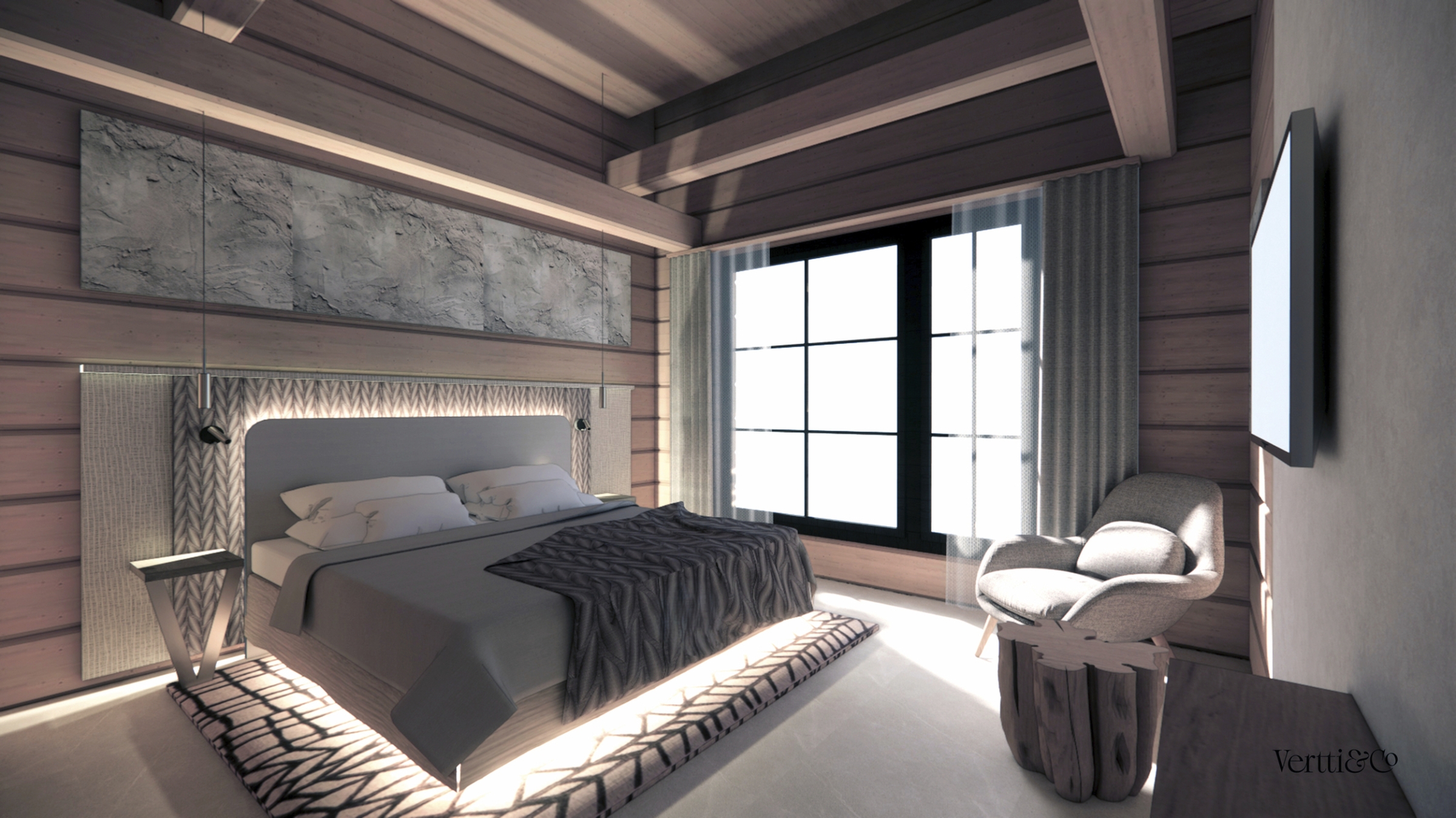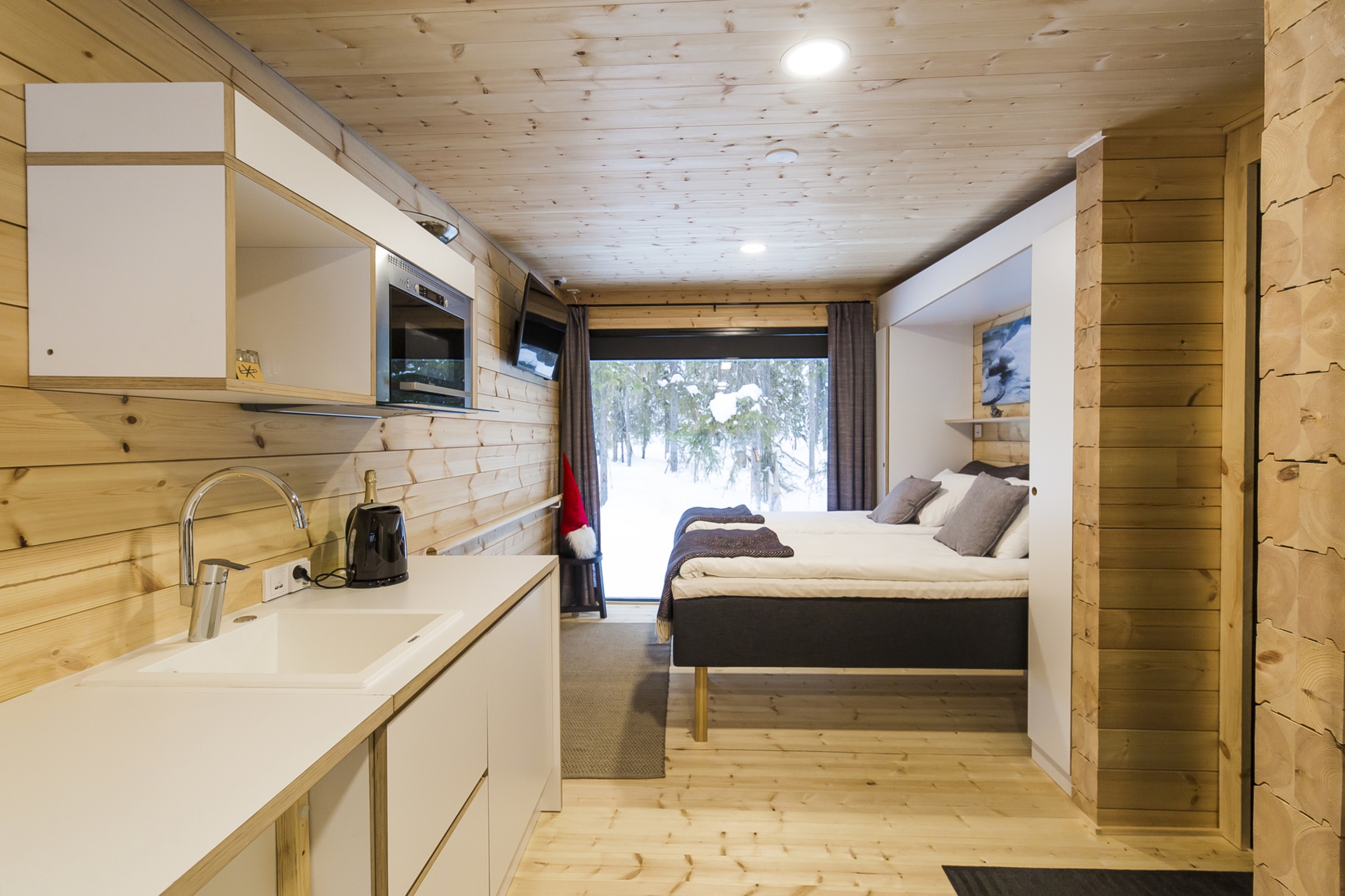Die insgesamt 12 Arctic Deluxe Zimmer werden im Sommer 2025 in den zwei freistehenden traditionellen Blockhäusern der Lodge neu errichtet, die ehemals die Stella Polaris oder Aurora Borealis Zimmer beherbergt haben. Die traditionellen Blockhaus-Fassaden werden bei der Renovierung weitgehend erhalten. Innen werden die Blockhäuser jedoch komplett neugestaltet, renoviert und modernisiert. Die neuen, modernen Arctic Deluxe Zimmer bieten ein warmes und gemütiches, aber gleichzeitig modernes Blockhaus-Design und große Fenster, die einen Blick in die tiefverschneite Natur bieten. Die Arctic Deluxe Zimmer haben eine Wohnfläche von ca. 18-22m² und bieten ein Doppelbett/zwei Einzelbetten, Sitzgelegenheiten, Flachbild-TV, eine Kaffeemaschine und ein eigenes modernes Bad mit Dusche, WC und Haartrockner. Die beiden Blockhäuser, in denen die 12 Arctic Deluxe Zimmer untergebracht sind, liegen etwa 50 Meter vom Haupthaus der Lodge und etwa 100 Meter von der finnischen Sauna am Fluss entfernt.