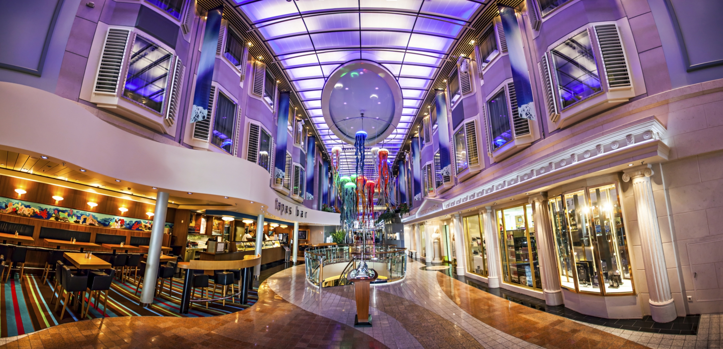 Color Class Kabine mit Promenadenblick: 14 m² große Kabine mit Aussicht auf die Shoppingpromenade. Die Kabinen liegen auf den Decks 8 und 9 und verfügen über Telefon, TV, Safe, Haartrockner, Minibar sowie ein Bad mit Dusche und WC. (2-er Belegung).