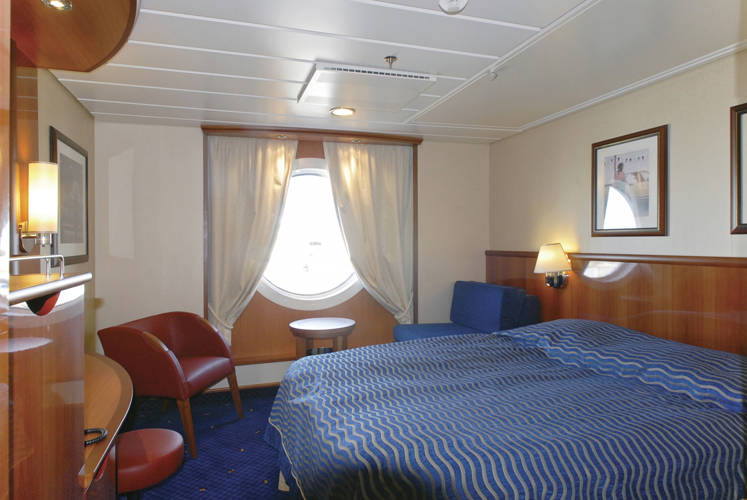 Standard-Außenkabine mit Meerblick: 10,5 m² große Kabine mit Meerblick und Doppelbett. Sie befinden sich vorne, mittschiffs und achtern (im hinteren Schiffsteil) auf den Decks 8, 9, 10 und 11. Die Kabinen verfügen über Telefon, TV, Haartrockner sowie ein Bad mit Dusche und WC. (2-er Belegung).