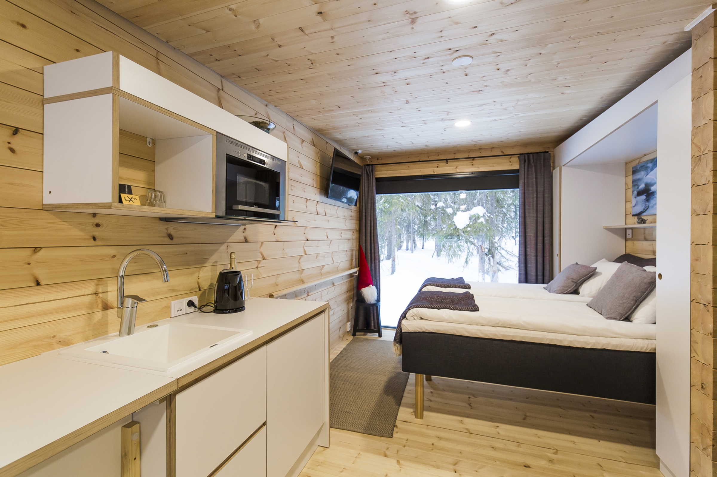 Die 25 freistehenden Panorama Design Cabins wurden im Sommer 2017 bzw. 2018 neu erbaut. Alle Panorama Cabins wurden aus heimischem Kiefernholz in moderner lappländischer Architektur erbaut und fügen sich harmonisch in die Natur ein. Die freistehenden Hütten haben eine Wohnfläche von ca. 16,5 m² und ein Panoramafenster mit herrlicher Aussicht in die unberührte Natur. Die Hütten verfügen über ein Doppelbett/zwei Einzelbetten, Sitzgelegenheiten, Tee-/Kaffeekocher, Mikrowelle, Flachbild-TV und ein eigenes Bad mit Dusche, WC. Die Hütten liegen inmitten der unberührten Natur etwa 100 Meter vom Haupthaus mit der Rezeption und dem Restaurant und etwa ebenfalls 100 Meter von der finnischen Sauna am Fluss entfernt.